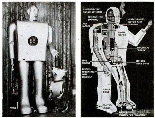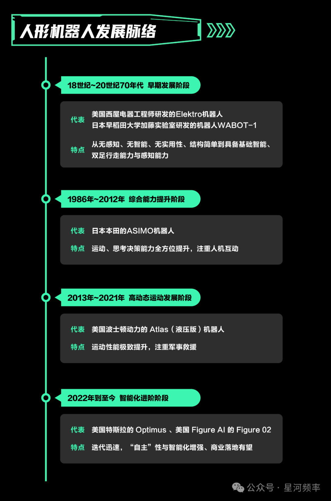 偃师向他展示了会唱歌、会跳舞的伶人。伶人是用木头、皮革等材料制作的。周穆王惊异不已,带上伶人一同回国。这是约公元前三世纪《列子·汤问》中记载的民间传说。在这个传说诞生的同一时期,亚欧大陆的另一端,也流传着发明家代达罗斯为克里特岛国制作了一个机械巨人「塔罗斯」,用以守卫宝岛的古希腊神话故事。从想象到成功创造人形机器人,人类花了 2000 多年。1973 年,第一个真正意义上的的人形机器人—WABOT-1 在日本早稻田大学诞生。WABOT-1 每迈一步需要 45 秒,步幅只有 10 厘米左右,每走一步都需要停下来再走下一步。以现在的眼光来看,WABOT-1 身形笨重,步伐缓慢,但在当时是巨大的进步。时间来到 52 年后,今年 5 月,特斯拉的机器人 Optimus 已经能够自如地行走并执行分拣电池,轻握鸡蛋等精细操作了。马斯克认为,十年后 Optimus 还会为特斯拉贡献 25 万亿美元市值。人形机器人,正在变得更加接近人类,展示出巨大的市场潜力。它从古代的神话传说和民间故事中萌芽,历经机械构造的初始探索,智能技术、运动能力的逐级突破,成本与应用的权衡等多个阶段,又在 AI 大模型、大数据云计算等技术的发展下,迎来重要突破期。1937 年,美国西屋电器工程师温斯利团队研发了机器人 Elektro。这台机器人高 2.1 米,重 118 公斤,能通过特定语音识别命令,行走,说话等等,甚至还有人宣称它能被远端控制。但实际上,Elektro 并不具备任何控制和管理能力,甚至对外界刺激也无法做出自主的反应。它不是真的会走路,而是通过弯曲左膝,拖着带滚轮的右腿沿轨道滑动。对话也是预先设定好的,通过藏在背后的唱片机发出声音。其他复杂行动,都需要人类助手来辅助完成。Elektro 是 18 世纪到 20 世纪 60 年代的机器人的缩影。这个时期,世界各地都陆续出现了具备基础人形外观的机器人,它们都只是一些机械元件的组合,通过简单的结构驱动,感知能力极弱,智力为零,体积庞大,实用性很低,远远达不到为人类服务的目的。虽然 Elektro 只是一个人形机械组合体,但它激发了美国大众对机器人的憧憬与想象,促使后续的机器人研发者不断改进机械结构,带动了美国机器人技术与产业的快速发展。第一台工业机器人 Unimate 和首台人工智能机器人 Shakey 就是在美国诞生。人形机器人发展早期,美国处于技术领先地位,可第一台人形智能机器人却是诞生于日本。这是因为在 Elektro 出现后,美国与日本出现了技术分野:美国选择了实用性更强的非人形机器人,日本坚持发展人形机器人。1954 年,美国发明家 George Devol 发明了 Unimate。这是一款机械臂式机器人,通过事先编程,它可以轻松执行将液态金属倒入模具、焊接车身等危险工作,24 小时不间断。Unimate 首先应用于美国通用汽车工厂,大大提高了汽车生产效率和质量,同时也彻底改变了世界制造业。时至今日,以机械臂式机器人为代表的工业机器人在汽车制造生产线应用率达 90% 以上,在电子产品、金属制品、塑料及化工产品等行业的应用也十分广泛。而与 Unimate 同时期的美国人形机器人仍然未能突破早期机器人的局限,它们既不能为生产带来价值,也无法将人类从工作中解放出来。人形机器人相比工业机器人的优势就是其通用性,要实现通用性,需要在运动控制与智能化方面都得到提升,而这是当年无法攻破的技术难关。于是,美国人形机器人在工业机器人的强大光环下渐渐式微。日本在发展人形机器人方面,则有着文化、技术与经济的良好土壤。由于《铁臂阿童木》动漫的风行,日本社会对人形机器人有着天然的亲和力。与此同时,二战战败的日本对技术陷入狂热的迷恋,大量从国外引入先进技术,经济飞速发展。在这样的背景下,1973 年,日本早稻田大学加藤一郎团队研发出世界上第一个全尺寸人形「智能」机器人 WABOT-1。WABOT-1 的出现是人形机器人发展历程中的关键事件,它标志着人形机器人:- 首次具备了基础的双足行走能力。WABOT-1 可以实现缓慢的静态步行,每步耗时 45 秒,步伐 10 公分。