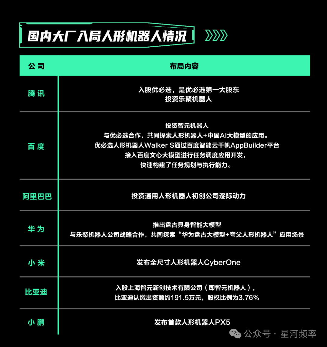 总体来看,人形机器人行业整体呈现出「企业冲刺、巨头下注」的态势,对技术、价格、量产规划各有侧重。在应用落地方面,人形机器人纷纷进厂实训。虽然多数企业宣称自己的人形机器人将具备通用性,但目前来看,新推出的人形机器人大多以汽车制造、物流仓储等工业场景为落地场景。这是一个迂回的路线:通过找到一个特定的应用场景,实现初步的商业化再逐步考虑其他功能的突破。问题是,在工业场景,人形机器人如果不能在环境感知、人机交互、适应复杂环境的能力上具备优势,尽快实现通用性,未来可能还会面临与工业机器人的竞争,陷入与 ASIMO 同样的困境。要在通用性上具备优势,人形机器人企业还需要跨过两座大山。高质量的训练数据是人形机器人实现泛用性的基础,也是降低人形机器人研发成本的关键所在。人形机器人的训练数据需要大量工程自主操作,或者由人类进行演示,这就导致数据收集效率较低且成本较高。数据是人形机器人学习的素材,而 AI 大模型则是学习的大脑。目前,AI 大模型还能未达到与人形机器人硬件相匹配的程度。比如,大模型的持续积累能力不足,积累的知识容易随着数据汇聚被遗忘。针对特定领域的大模型训练不够充分,部署成本太高等等。人形机器人还缺乏可表达的、可扩展的、足够快的实时推理模型。此外,人形机器人也需要克服硬件成本问题。有报告显示,人形机器人的硬件总成本目前约为 5 万美元。以色列智能机器人中心主席 Yosi Lahad 认为,人形机器人成本需要降到 2 万美元以下,才能够得到大规模采用。尽管人形机器人的发展仍然面临诸多限制,但行业热潮不减。毕竟谁也不知道,人形机器人的技术奇点何时到来。谁先占领高地,谁就掌握了在未来彻底改变人们生活方式的命脉。