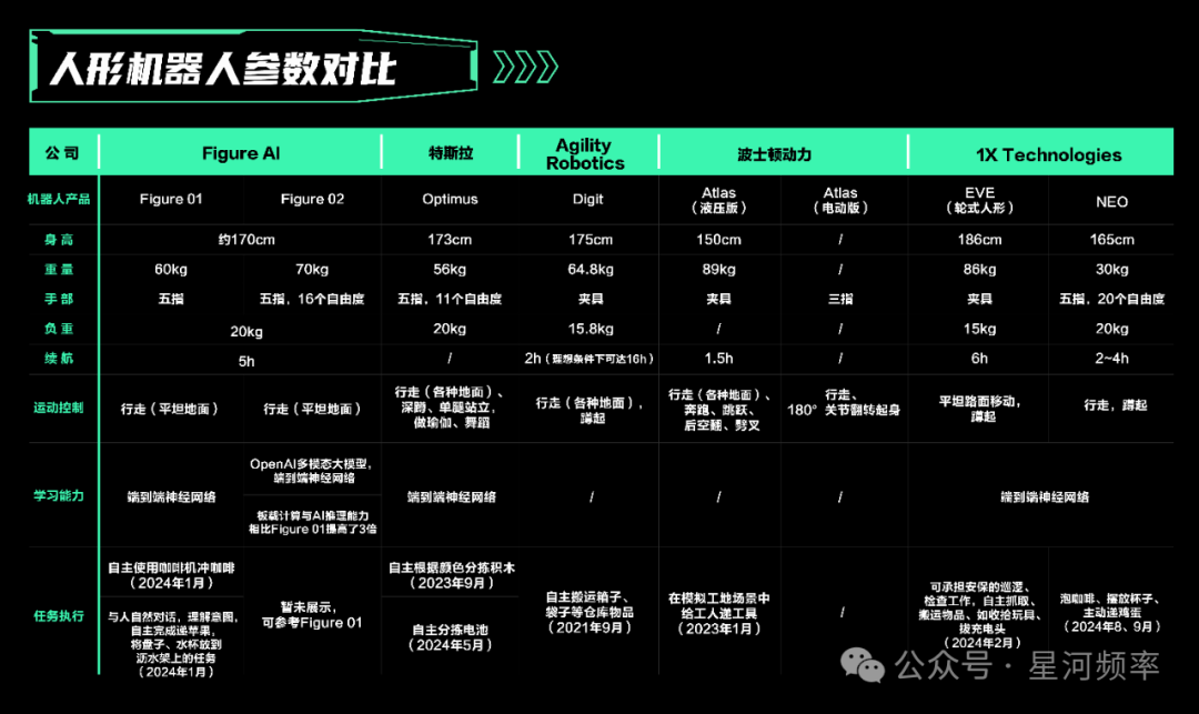 从产品表现看,Optimus、Figure 01/02、NEO 三款机器人综合能力最强:- Optimus、Figure 01/02 的学习能力较强。