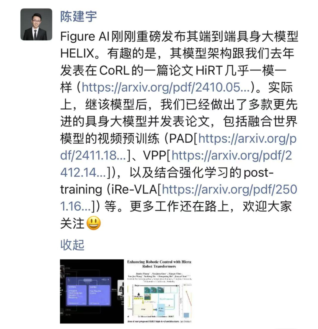 例如,星动纪元在 2024 年就将清华姚班团队提出的 HiRT 框架(星动纪元创始人陈建宇亦为 HiRT 论文作者之一)的快慢系统架构应用到自研的端到端原生机器人大模型 ERA-42 中;而 2025 年美国明星人形机器人企业 Figure AI 发布的 Helix 模型,恰好采用了与 HiRT 高度相似的架构。