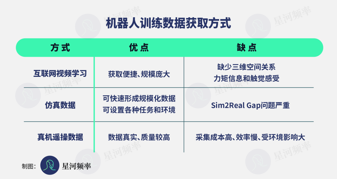 目前,业内获取机器人训练数据的方式主要有互联网视频学习、仿真平台生成数据和真人遥操采集三条路径,但各自都有显著的局限性。目前行业内主流的方案是采用「真机+仿真数据」的融合路径。