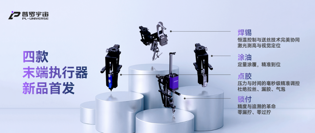 基于对工厂核心工序的深入分析,普罗宇宙采取了「先标准化,再通用化」的策略,发布锁付、焊锡、点胶、涂油四款标准化工业末端执行器。