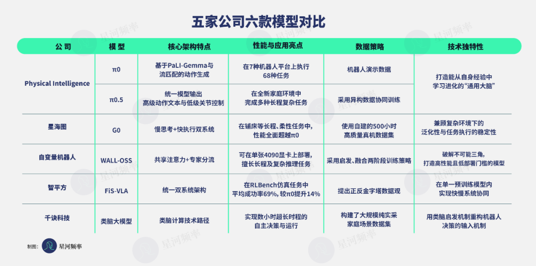 在这一共识下,五位玩家也依据自身优势,形成了差异化的定位:PI 是结果导向、技术驱动的典范;星海图代表了数据驱动+开源生态的路径;自变量深耕软硬一体协同发展;智平方是场景优先派,注重模型实际应用价值;千诀科技则是前沿理论派。