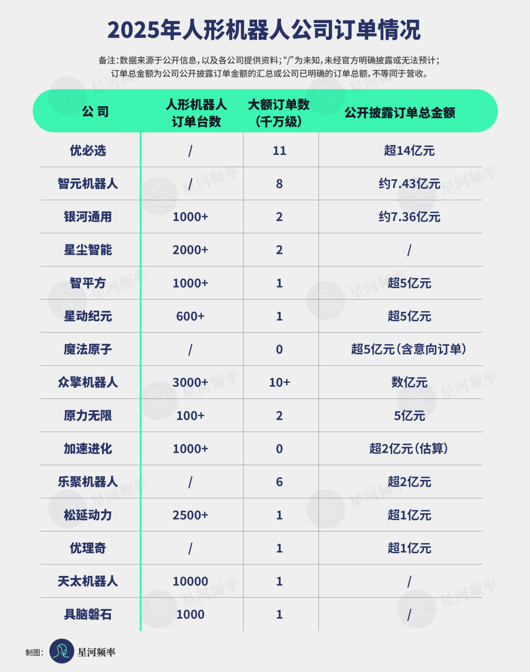 根据已披露的订单总金额,优必选、智元与银河通用位列前三。