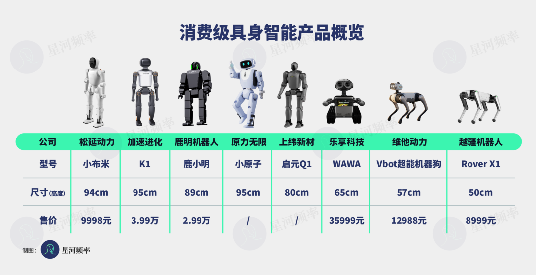 目前市场上的代表性产品包括松延动力的小布米、加速进化的 K1、原力无限的小原子、鹿明机器人的鹿小明、上纬新材的启元 Q1 等。