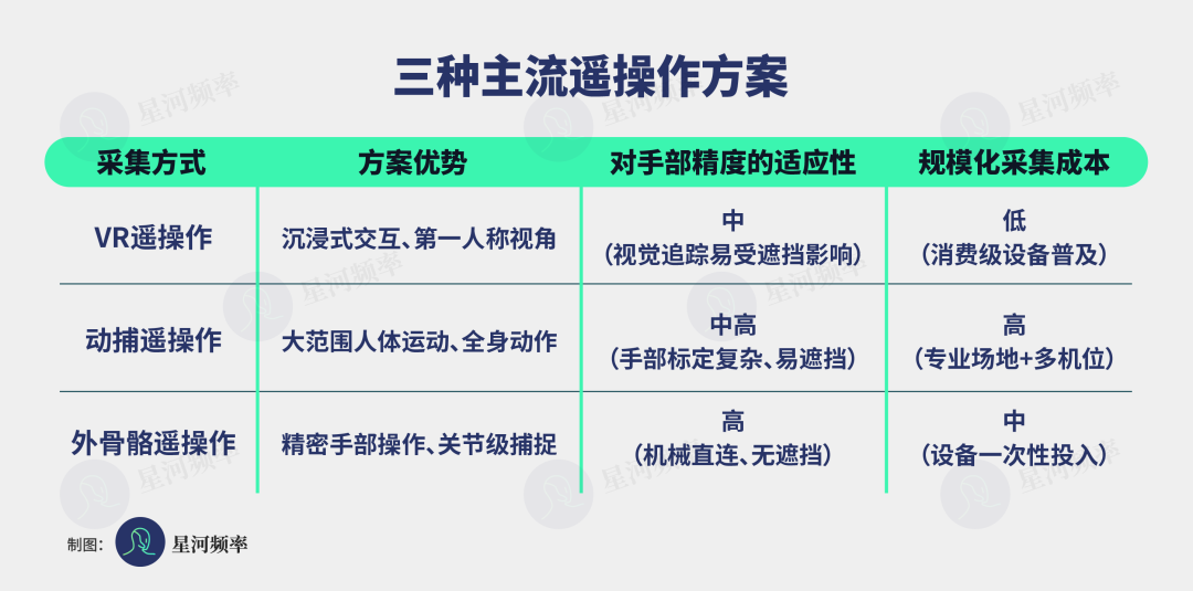 目前,遥操作主要由三种方式实现,分别是 VR 遥操作、动作捕捉和外骨骼遥操作。经过几年的产业试错,每条路径的能力边界已经清晰。