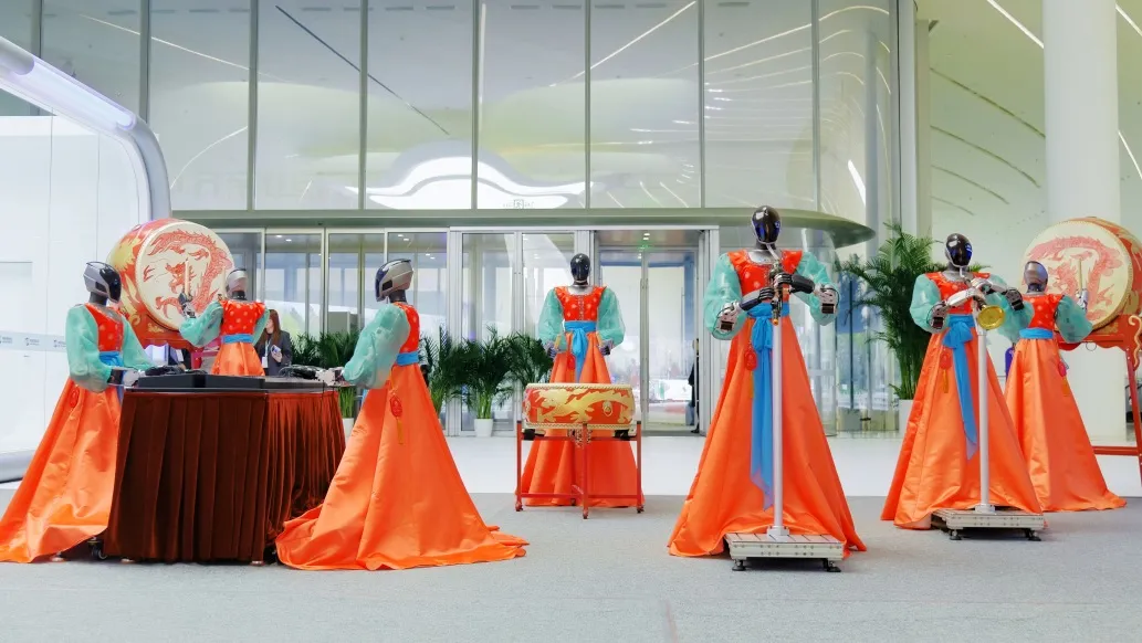 在另一个展区,8 台搭载灵巧手的机器人组成的灵心乐府乐队,弹钢琴、敲大鼓、吹葫芦丝,配合人形机器人伴舞,展示了《北京欢迎你》《茉莉花》等四首经典曲目。